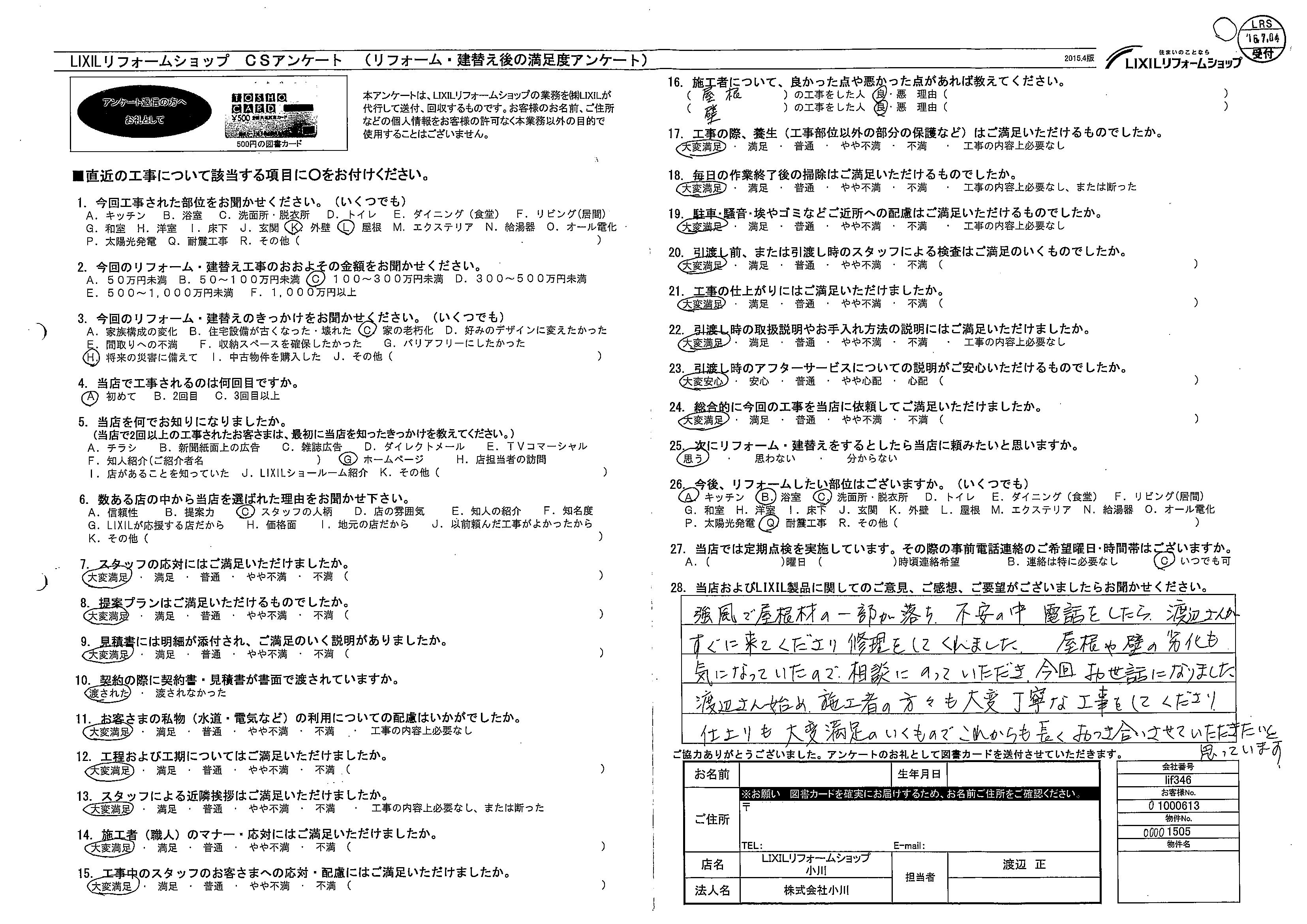 担当の渡辺さんを始め、施工者の方々にも丁寧な対応と工事をしていただき、仕上がりも大変満足のいくものでした。