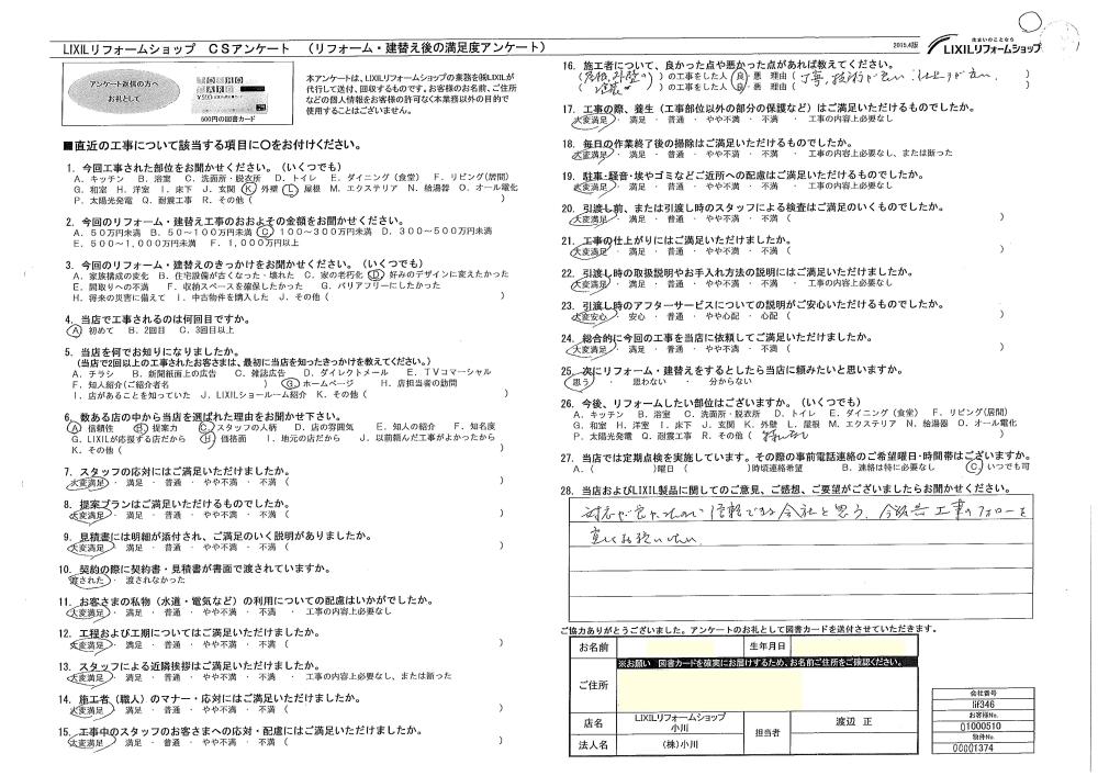 担当された渡辺様の真面目な対応ぶりやこれまでの施工実績のみならず、建物に対する的確な現状判断と施工提案に対して信頼を以てお任せすることができました。