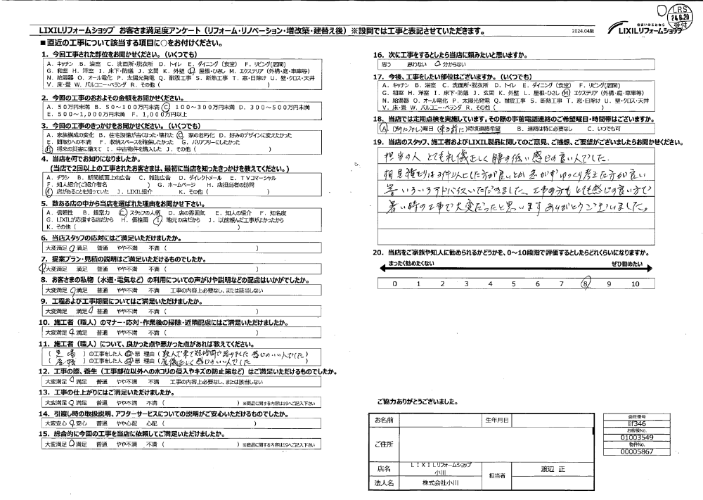 工事の方もとても感じの良い方で暑い時の工事で大変だったと思います。ありがとうございました。