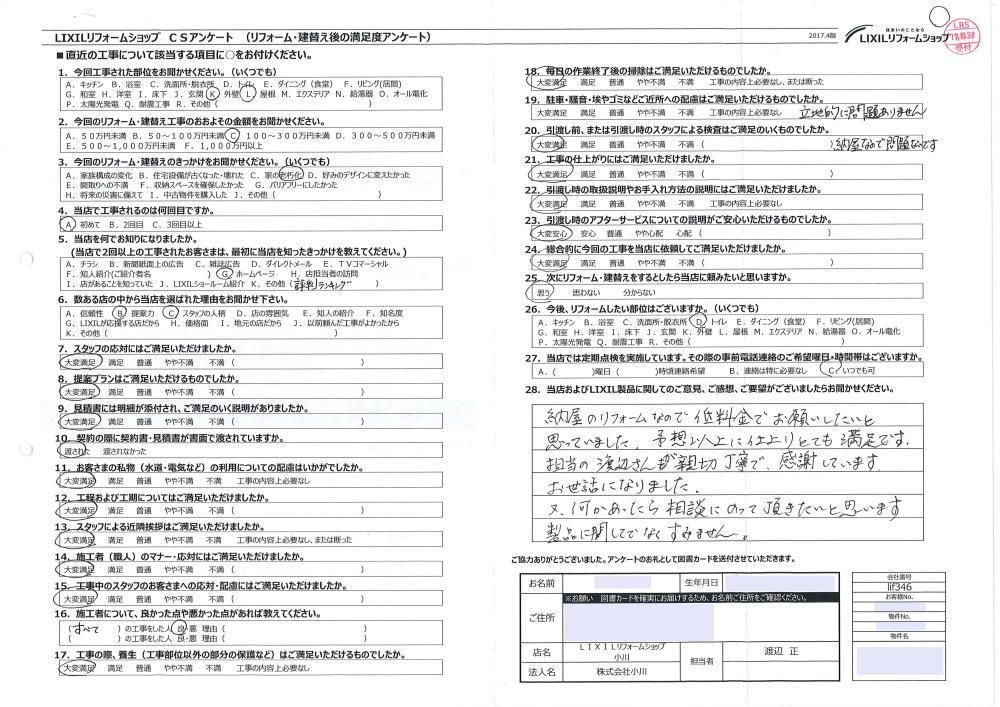 納屋のリフォームなので低料金でお願いしたいと思っていました。予想以上に仕上がり、とても満足です。担当の渡辺さんが親切丁寧で感謝しています。お世話になりました。又、何かあったら相談にのって頂きたいと思います。