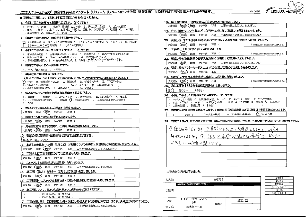 前回もお世話になり予算的にも仕上がりも満足でしたのでこの度もお願いしました。今後も不具合が生じた場合はどうぞよろしくお願い致します。