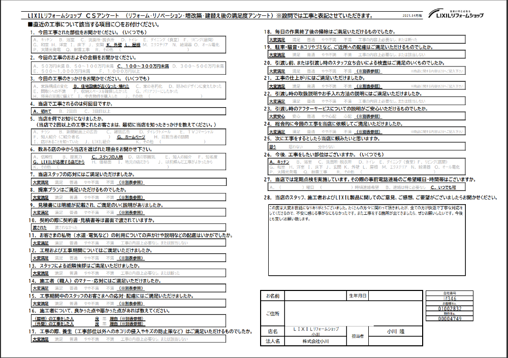 この度は大変お世話になりありがとうございました。たくさんの方々に関わって頂きましたが、全ての方が快活で丁寧な対応を してくださるので、不安に感じる事がなにもなかったです。また工事をする箇所が出てきましたら、ぜひお願いしたいです。今後 とも宜しくお願い致します。