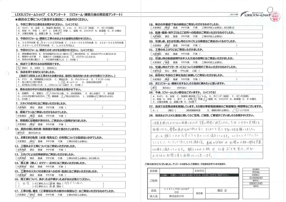 1年前見積りを小川さんに依頼しましたが、予算の関係で断念しました。今回、2回目の見積りを依頼しました。営業の渡辺さんの人柄の良さ、まじめさを感じリフォームをお願いしました。ペンキ職人さんの仕事ぶりを見てとても満足しています。モルタルとサイディングの隙間もコーキングして頂きとても満足です。屋根のくぎ打ちや外壁の細かい部分も塗装して頂き満足しています。職人さんの人柄や仕事ぶりを見て、次も小川さんに外壁工事を依頼したいと思います。