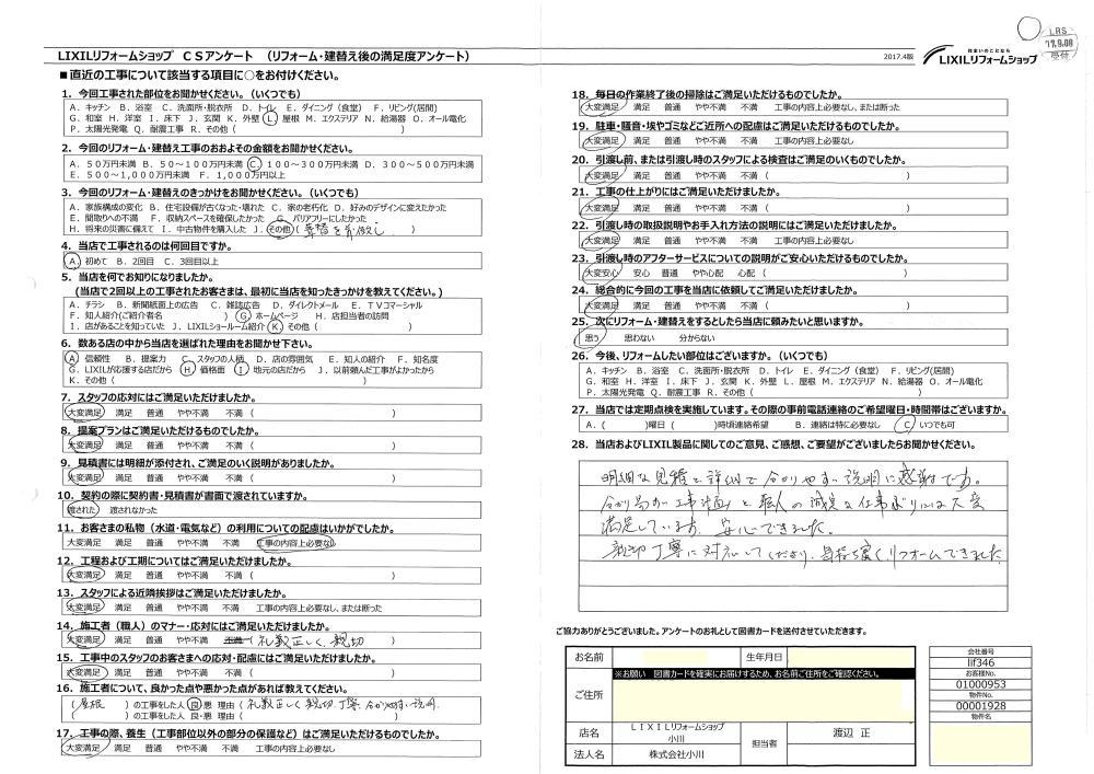 明細な見積りと詳細で分かりやすい説明に感謝です。分かり易い工事計画と職人の誠実な仕事ぶりには大変満足しています。安心できました。親切丁寧に対応してくださり、気持ちよくリフォームできました。